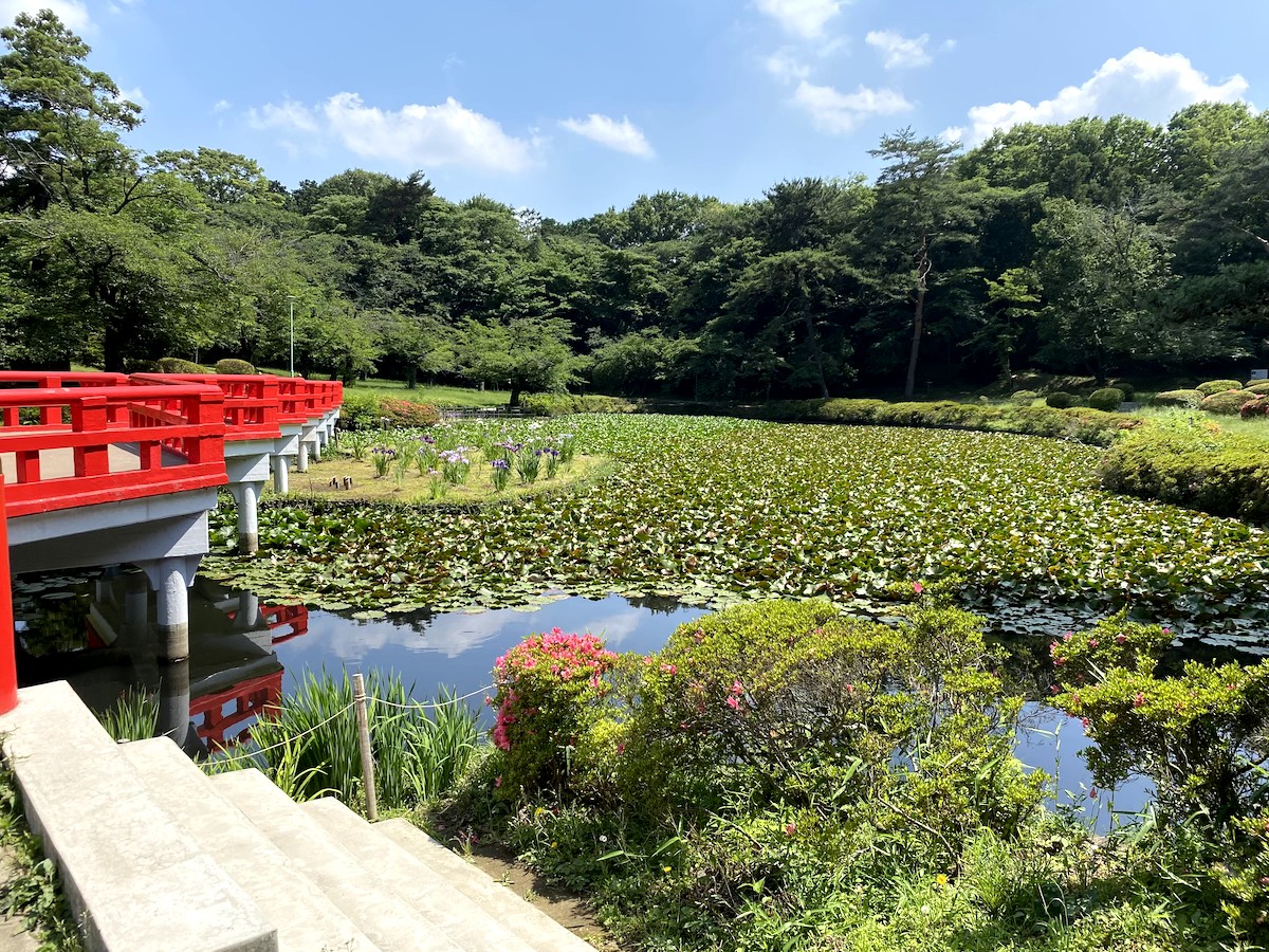 自然林に囲まれた大きな園内には真っ赤な漆塗りの八つ橋がかけられていて、四季の植物と合わさりとても美しいです。